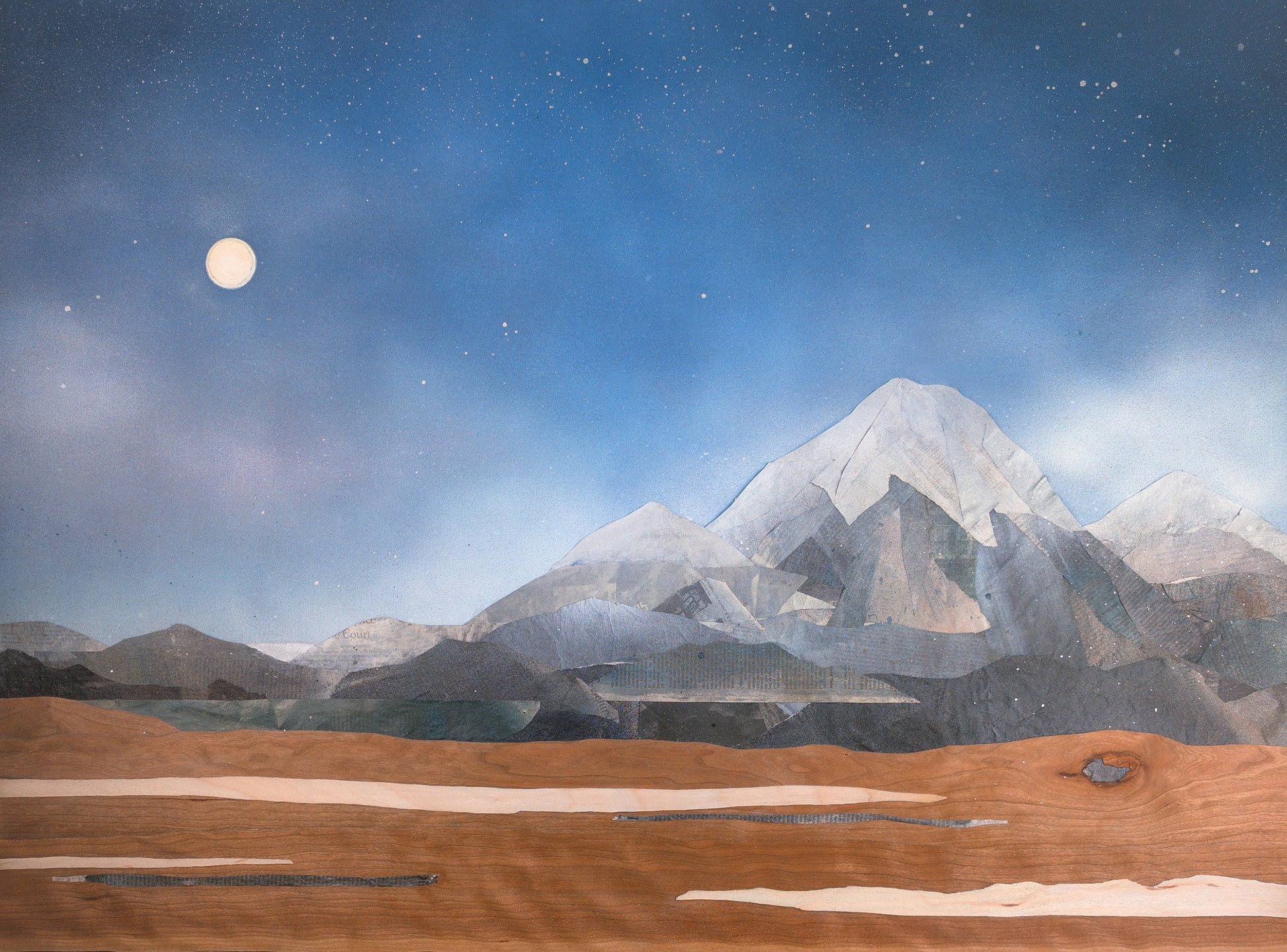 In this print, Mount Rainier stands tall, made from painted pandemic-era newspapers. It's grounded in layers of cherry wood veneer and strips of maple all below the deep blue spray-painted sky.